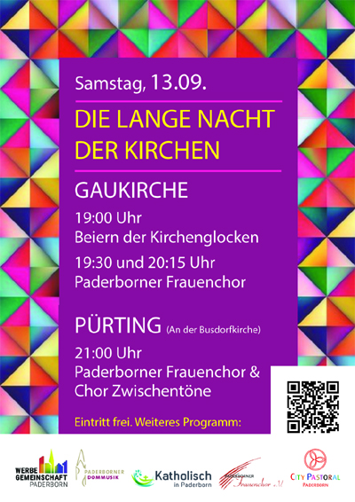 Wie im vergangenen Jahr, wird sich der Paderborner Frauenchor wieder mit am Programm der Langen Nacht der Kirchen beteiligen. Der Frauenchor wird um 19.30 und 20.15 Uhr in der Gaukirche auftreten und zum Zuhören und Mitsingen einladen. Begleitet wird der Chor von Markus Maurer am Klavier und zwei weiteren Instrumentalisten. Um 21.00 Uhr ist dann ein weiterer Auftritt unseres Chores im Pürting der Busdorfkirche geplant. Im letzten Jahr war der Pürting das erste Mal Auftrittsort und wurde begeistert angenommen. Dieser besondere Ort, in der Dunkelheit von der City Pastoral illuminiert und wunderbar in Szene gesetzt, gepaart mit passendem Gesang, beschert dem Publikum besondere Gänsehautmomente. Diese jährlich stattfindende Veranstaltung ermöglicht ein besonderes Kulturerleben. Herzliche Einladung zur Teilnahme an der diesjährigen Langen Nacht der Kirchen am Samstag, 13.09.2025. Der Eintritt ist frei, um eine Spende wird gebeten.